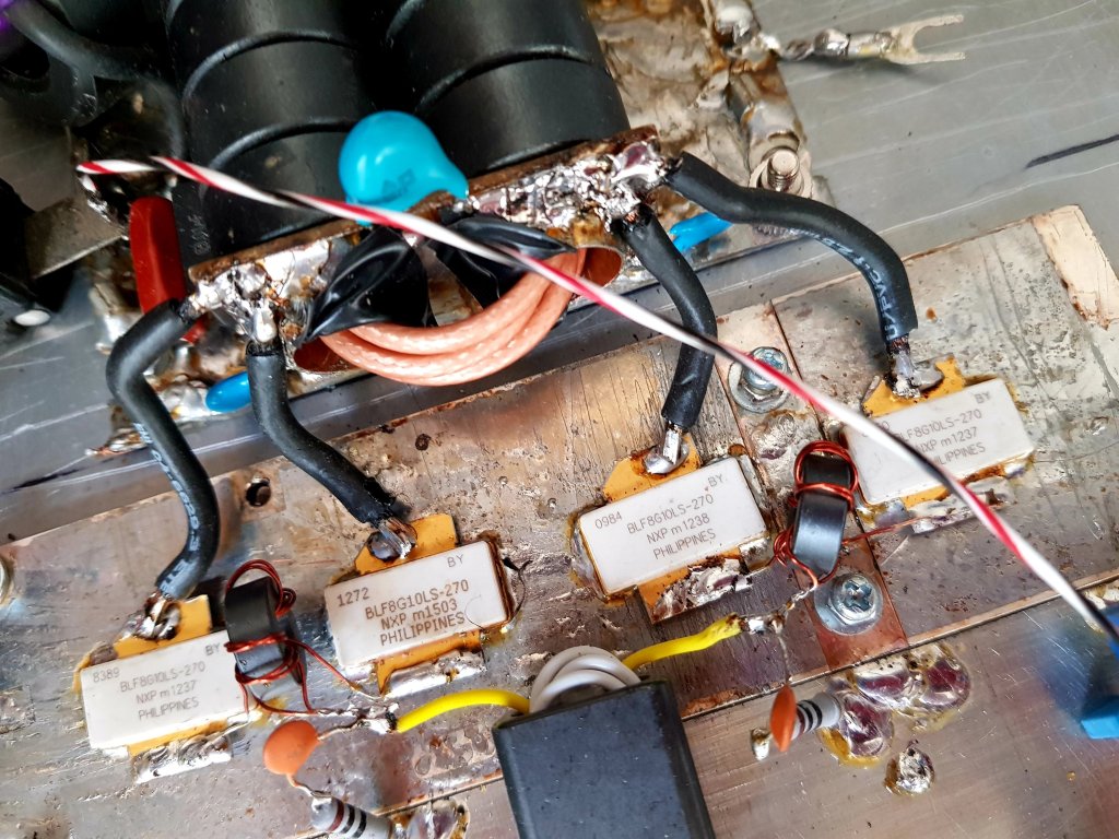 Mencoba 4x mosfet ini dengan prediksi awal bisa mencapai angka 750W dengan transformer output impedansi 1:25. Angka ini bisa tercapai dengan input 1,5W dan Idq total 1000mA. VDS=28V dan Arus puncak yang tampak pada jarum amper meter 40A lebih. Output drain mosfet diparalel dan input menggunakan splitter.