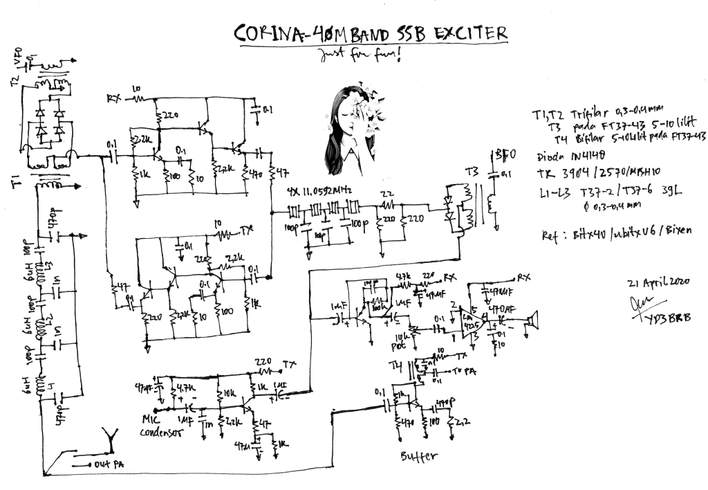 Rangkaian ini adalah eksperimen :). Exciter 40m band ini berbasis Bitx. Hanya digunakan sebuah blok TIA (Termination Insensitive Amplifiers) ala Wes Hayward. Sedang bagian IF digunakan 4 pole xtal 11.0592 MHz. Untuk bagian audio amplifier digunakan LA4225. Secara keseluruhan, rangkaian ini lebih sederhana dari Bitx40 :).