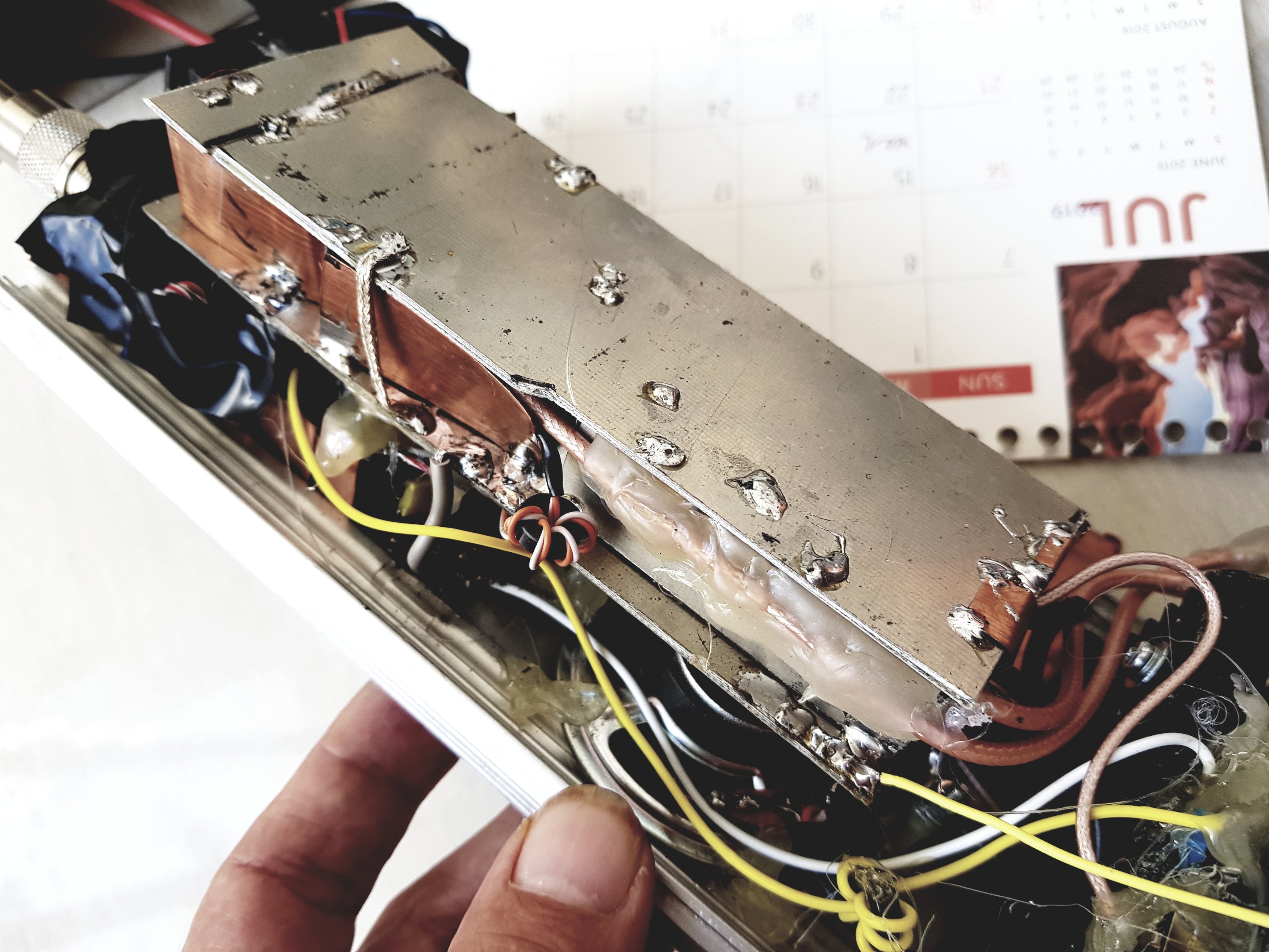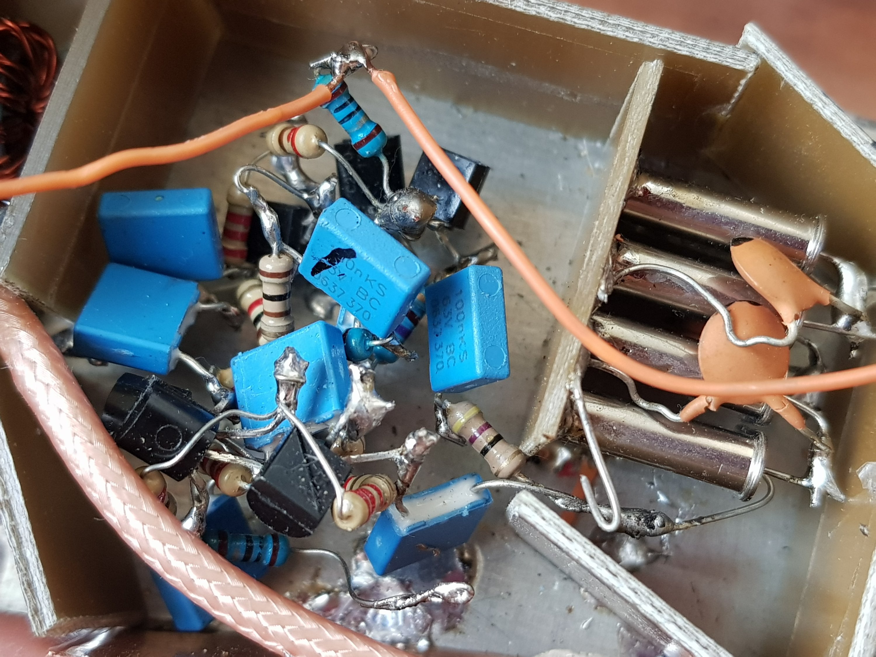 Desain rangkaian diterapkan ala deadbugs /ugly construction. Model ini cocok untuk eksperimen. Pergerakan dari ide ke praktek sangat cepat. Tidak perlu membuat PCB dulu karena segala sesuatu masih ujicoba. Memang butuh kerja tangan dan imajinasi hehehe. Secara umum tidak dianjurkan untuk jaman now :).