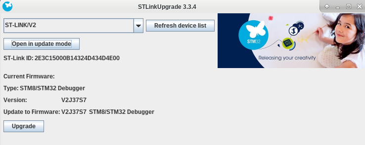 ST-LINK V2 juga perlu diupgrade firmware nya. Hal ini mudah dilakukan saat download program ke flash STM32 akan muncul peringatan.