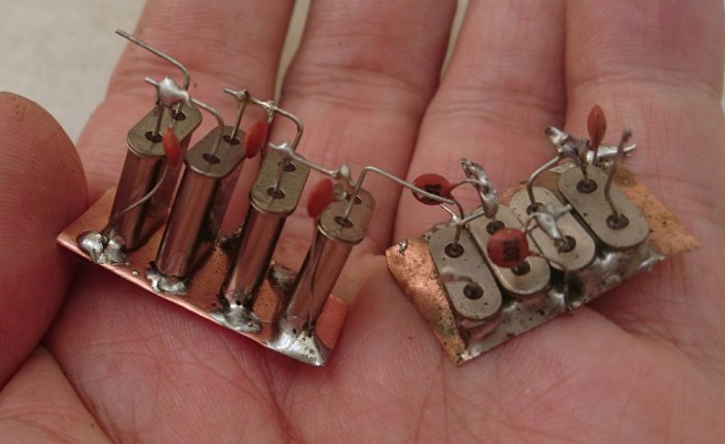 Pertama soal Xtal Ladder Filter. Gambar sebelah kiri adalah Xtal pilihan. Empat Xtal “identik” hasil seleksi dari 50 biji Xtal. Sebelah kanan Xtal diambil acak asal comot saja pokoknya filter jadi.