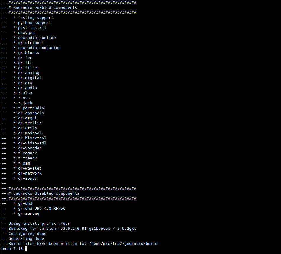 Setelah instruksi cmake, perhatikan laporan yang dimunculkan. Mana yang aktif/enable mana yang disable. Laporan depedency akan dimunculkan. Misal “scipy & pyQTGraph not found” pada bagian filter. Instal dulu jika bagian itu diperlukan.