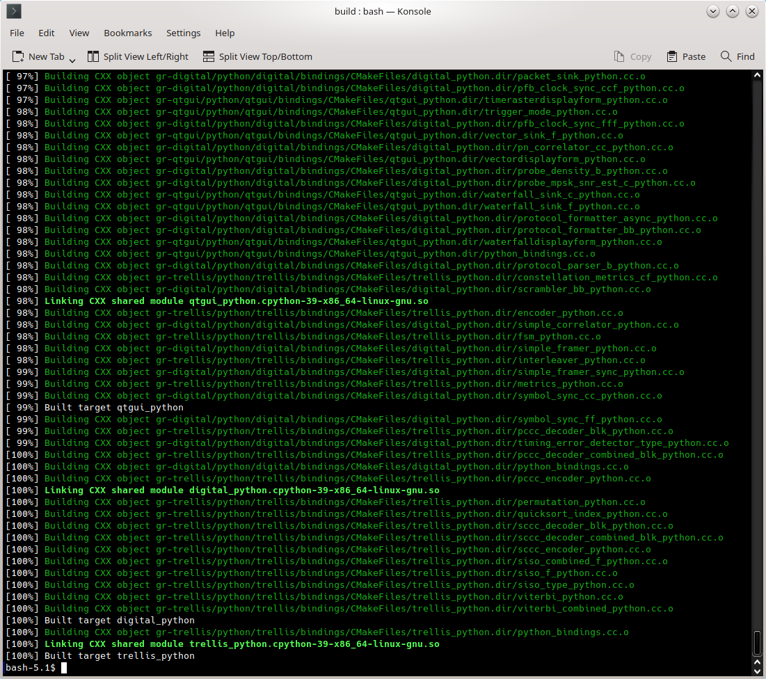 $cd folderAnda $git clone https://github.com/gnuradio/gnuradio.git $cd gnuradio $git checkout maint-3.9 $mkdir build $cd build $cmake -DCMAKE_BUILD_TYPE=Release -DCMAKE_INSTALL_PREFIX=/usr -DPYTHON_EXECUTABLE=/usr/bin/python3 ../ $make -j3 $make test $su #make install #ldconfigJangan lupa baris $git checkout maint-3.9 pada urutan di atas untuk versi 3.9 terbaru. Jika Anda punya komputer dengan prosesor 8 core, pada make bisa ditambahkan make -j7 agar memakai 7 core saat kompilasi. Yang 1 core untuk nonton youtube lol. Punya saya quad core, jadi cukup make -j3.