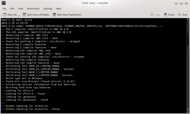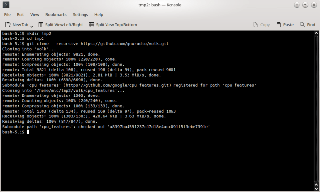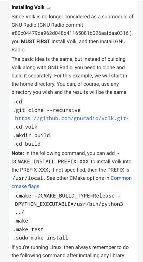 Saya menggunakan versi git clone untuk volk & GNU Radio. Mulai versi 3.9, GNU Radio memisahkan Volk menjadi bagian tersendiri. Jadi Volk mesti dikompilasi & diinstal terlebih dahulu.