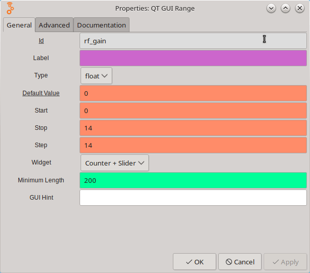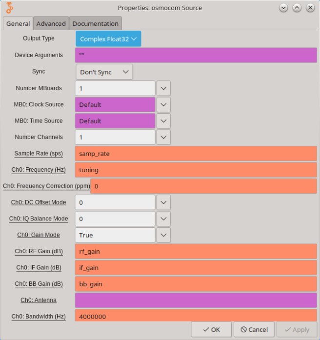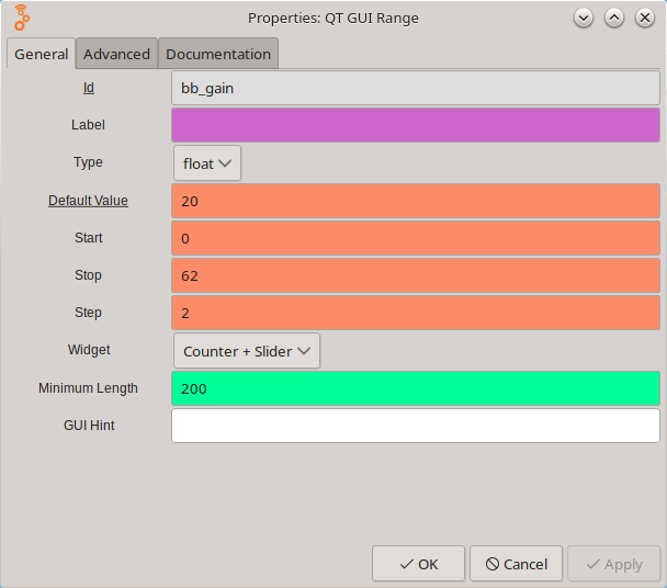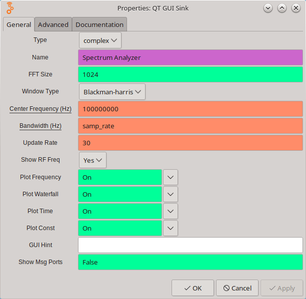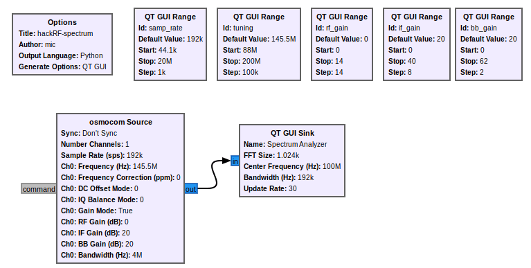 samp_rate 44,1K -20MHz step 1KHZ, tuning 88MHz – 200MHz step 100KHz, rf_gain 0dB/40dB, if_gain 0-40dB step 8dB, bb_gain 0-62dB step 2dB. Default value seperti yang tercantum pada blok.
