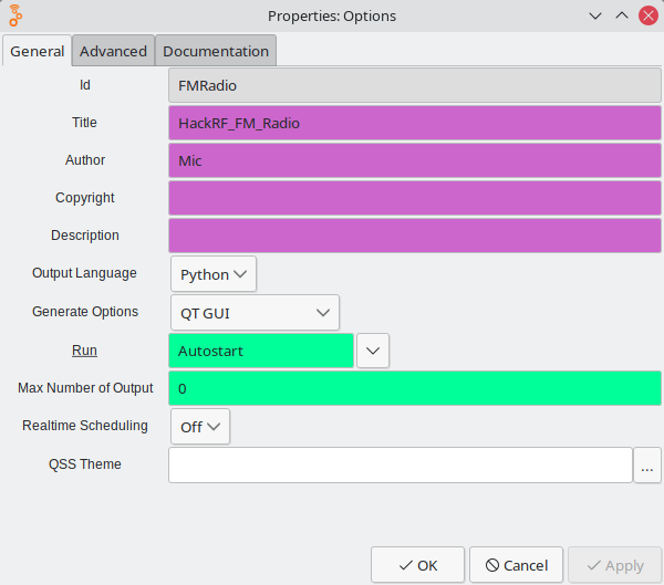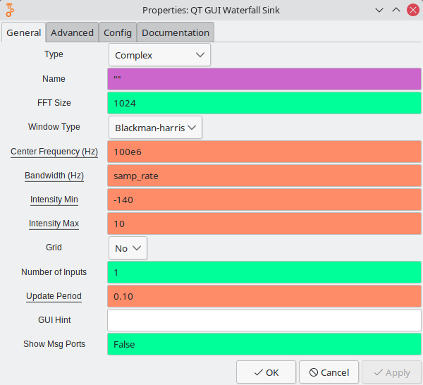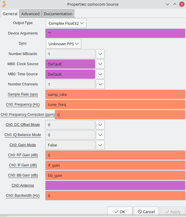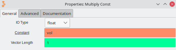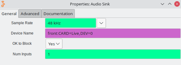 Catatan : Untuk blok Audi Sink, nilai device bisa dikosongkan atau isi dengan nama perangkat audio Anda. Penulisan angka pada blok mesti hati-hati. Jika ingin 20MHz, maka tulis 20e6 atau 20000000. Jika dimasukkan 20M, blok akan protes hehe.