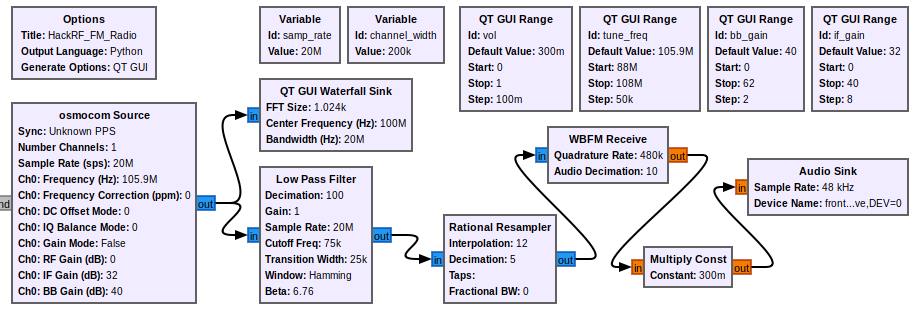 “Hello world!” pada dunia RF adalah membuat radio. Karena sebuah inisiasi, hal ini pantang dilewatkan saat bermain dengan GNU Radio + SDR. Digunakan HackRF One dengan rangkaian blok yang sederhana saja.