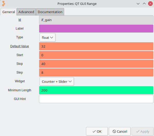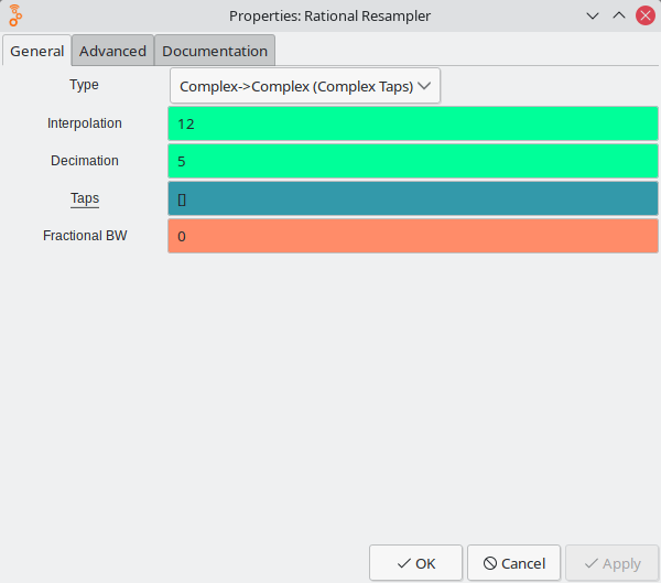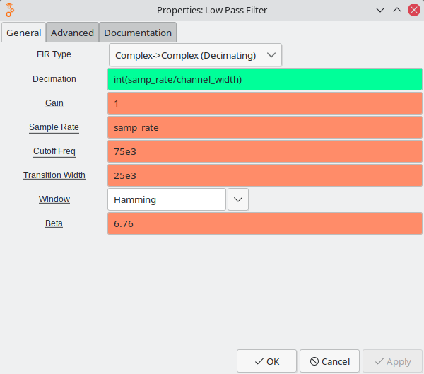 Pada kolom ini diisi :int(samp_rate/channel_width). Karena menggunakan variabel, jika nilai samp_rate diturunkan, maka nilai Decimation akan ikut berubah otomatis. Misal nilai samp_rate diubah jadi 4MHz, maka nilai Decimation akan menjadi 4MHz/200KHz = 20.