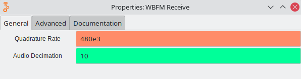 Karena bagian WBFM Receive dengan nilai Decimation 10, akan menghasilkan nilai sampling (480KHZ/10)= 48KHz untuk bagian Audio Sink.