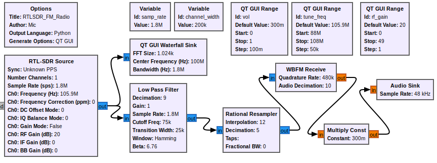 Kali ini digunakan GNU Radio dan RTL-SDR yang murah meriah. Hanya butuh modifikasi sedikit dari blok diagram GNU Radio punya HackRF One agar RTL-SDR dapat digunakan sebagai radio penerima FM.