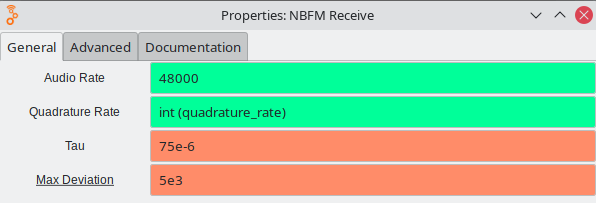 Bagian LPF, Fractional Resampler, dan NBFM mesti selaras. Untuk Quadrature rate 380KHz, maka bandwidth yang memungkinkan adalah 12KHz, 16KHz, dan 24KHz.