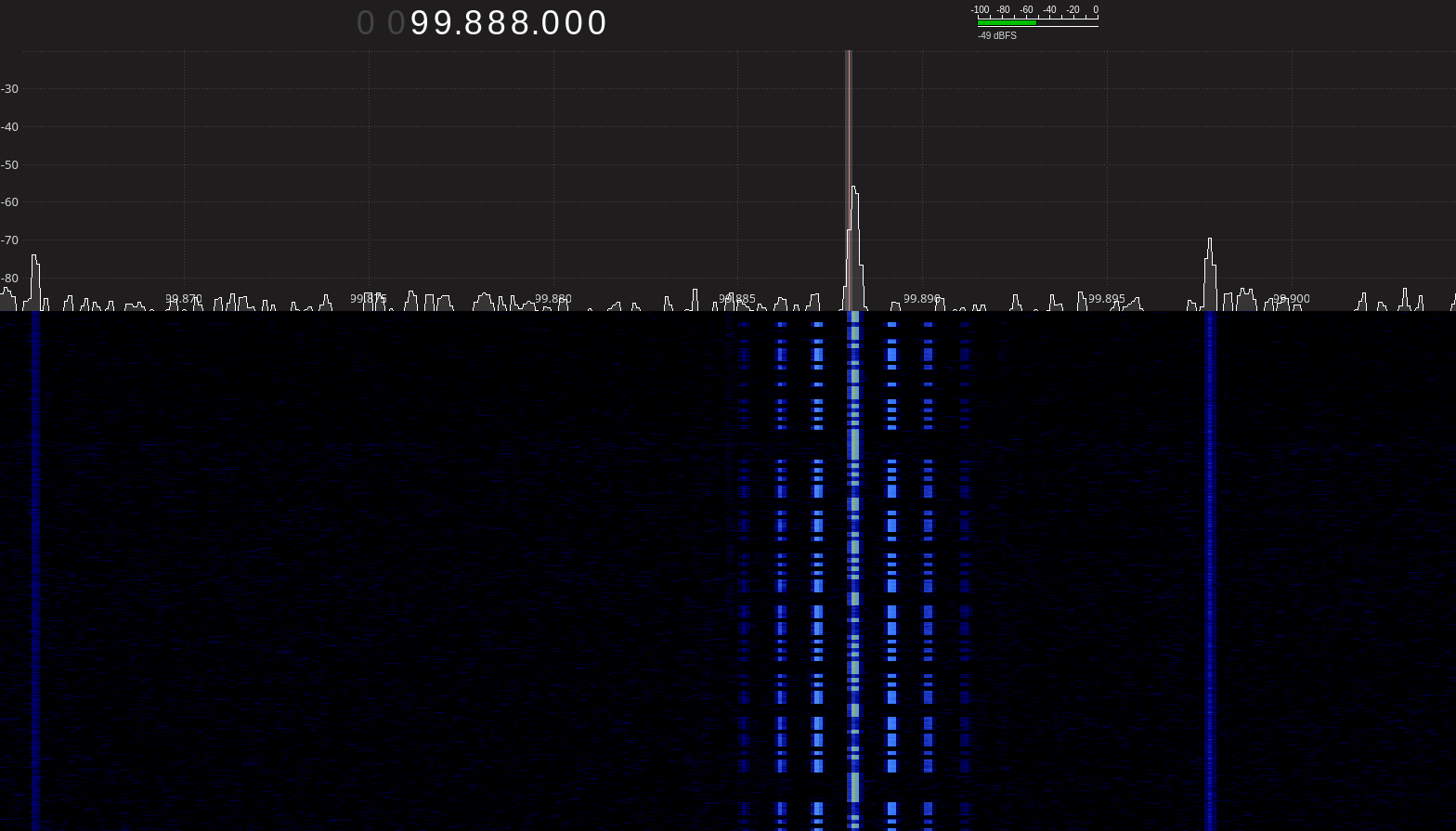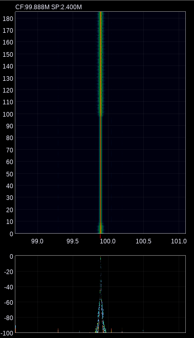Karena antena yang terpasang adalah dipole untuk frekuensi 100MHz, maka saya set Tx di 99,888MHz. Modulator yang dipakai adalah NFM Modulator. Signal yang dipancarkan mode CW : “CQ CQ yd3brb here”