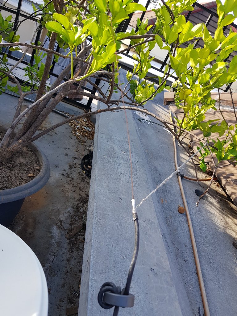 Kemudian kabel dibentang. Ujung yang satu nempel tembok tetangga kiri, yang lain tembok sisi kanan. Kalau kurang panjang, sambung dengan tali rafia hehe.