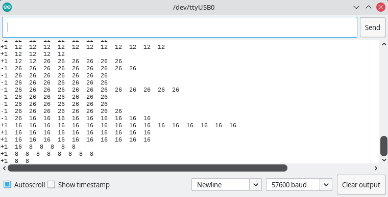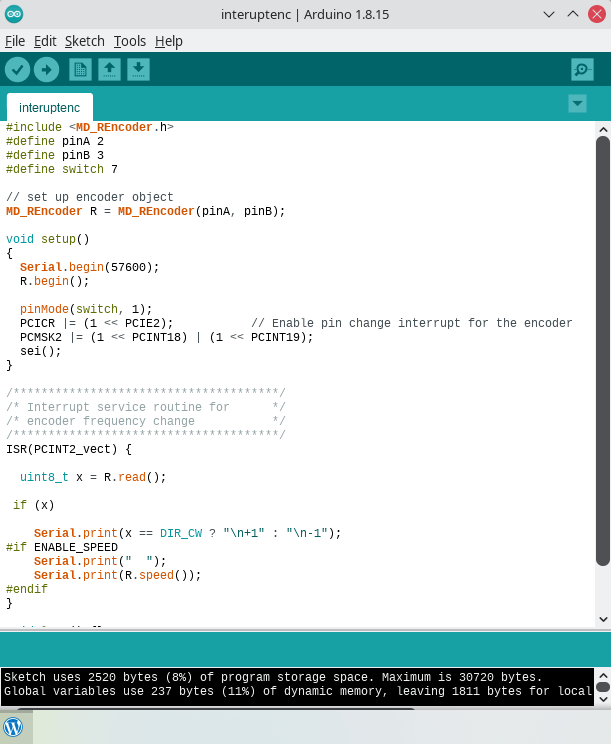 Sayang contoh Interupt dari MD_Rencoder tidak tersedia, jadi saya bikin cepat-cepat di atas. Upload program di atas, dan buka terminal serial pada Arduino IDE (set baudrate 57600). Kemudian putar encoder Anda.