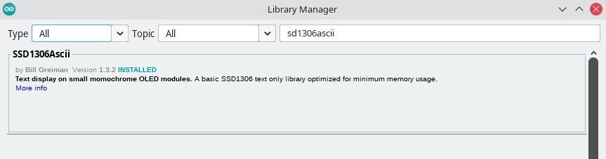 Bagian ini membahas OLED. Tes sederhana dengan menggunakan contoh yang telah disediakan oleh SD1306 ASCII Library. Sebelumnya download dulu SSD1306Ascii: Tools –> Manages Libraries