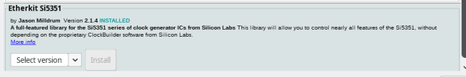Untuk library digunakan Etherkit Si5351. Instal terlebih dahulu Library ini pada Arduino IDE. Setelah itu ke bagian example untuk test modul Si5351 apakah berjalan dengan baik. Kalibrasi (nantinya) diperlukan agar frekuensi yang dihasilkan untuk BFO ataupun VFO tidak beda jauh dengan yang diharapkan.