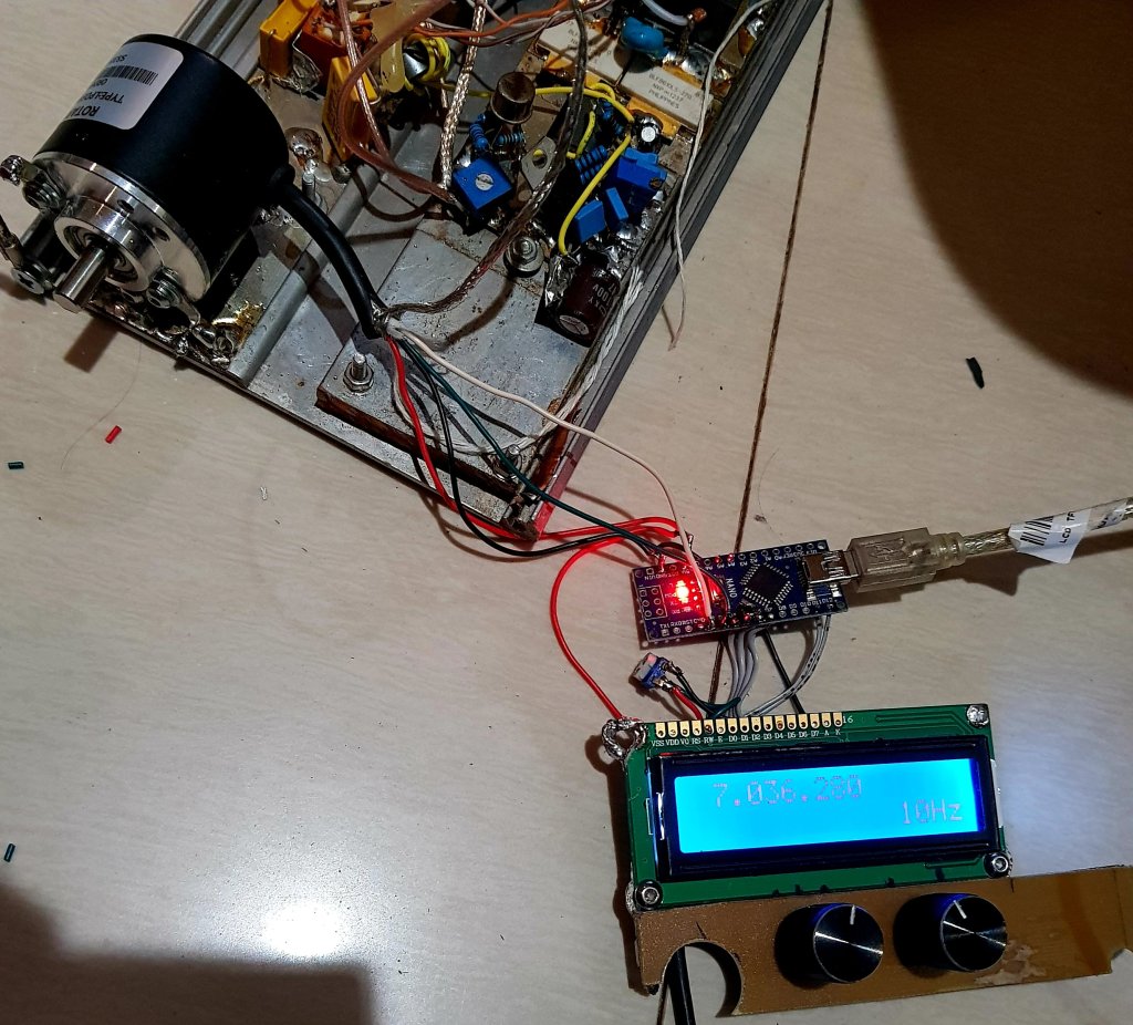 Untuk LCD, saya pakai bekas yang murah meriah …. 5 ribuan sebiji hehe. Saya pasang langsung dipanel untuk ujicoba sekalian dengan perangkat TRX. Untuk rotary encoder digunakan encoder optik yang mulus muternya. Ini seperti cafe late dibanding kopi tubruk untuk encoder standar.