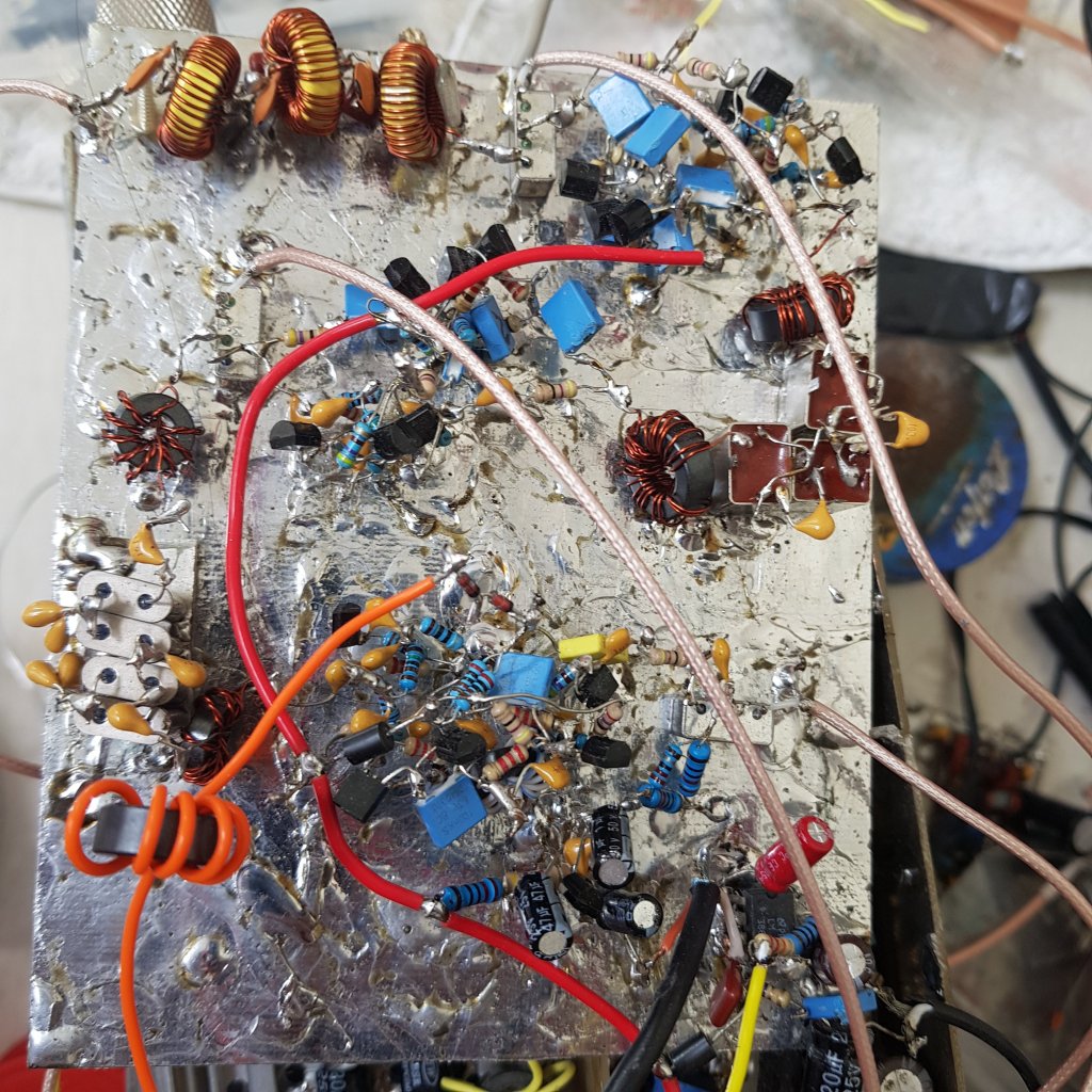 Iseng melakukan cascade (alias dirangkai seri dengan coupling kapasitor 10nF) 3x 8 pole xtal filter. Total jendral ada “24” xtal :). GMCF21G15D merupakan MCF (Miniature Crystal Filter). Ide ini gara-gara total IF gain pada rangkaian strip IF terlalu besar. Ini untuk band 40M ya. Saya menggunakan 3 blok TIA ala Wes Hayward.