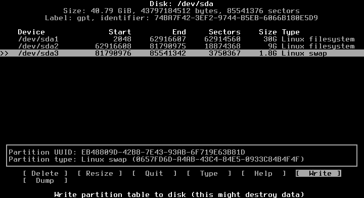 Jika Anda ingin merubah, tinggal Delete saja semua partisi dan ulangi dari awal dengan ukuran yang berbeda. Lakukan berkali-kali hingga pas di hati. Jika sudah selesai, pilih Write (dan tekan Enter) maka akan muncul pertanyaan yang perlu dijawab dengan mengetik : yes. Lalu tekan Enter. Proses partisi telah selesai. Pilih Exit.