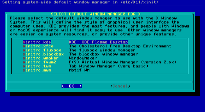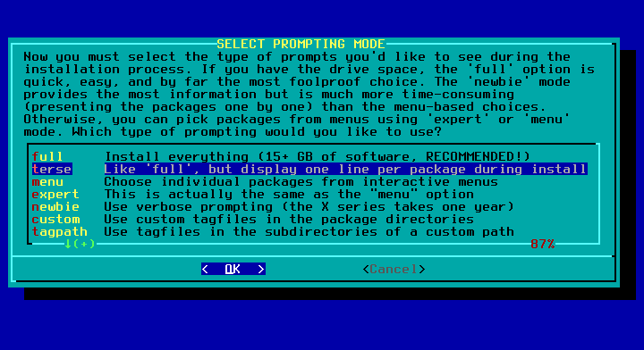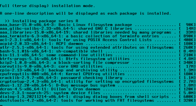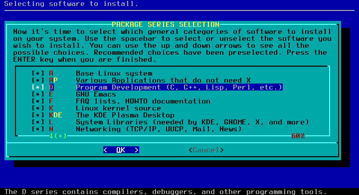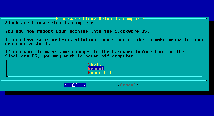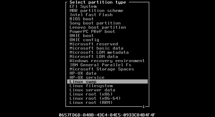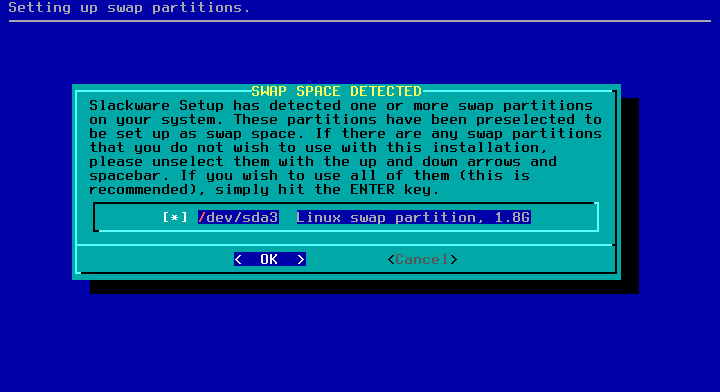 / sebesar 30G, /home 9G, dan sisanya swap.Caranya : pilih New pada free space dan isikan 30G. Pilih New lagi di freespace yang tersisa dan isi 9G. Pilih New lagi di freespace tersisa, ini akan jadi swap. Pilih partisi (dalam hal ini /dev/sda3) pilih Type. Pilih Linux swap.Full instal Slackware membutuhkan 16GB+. Jadi pertimbangkan besar partisi /. Dalam kasus ini dijatah 30GB. Jika punya hardisk 1TB, bisa diberi space 100GB misalnya.