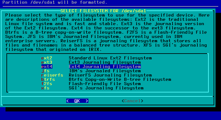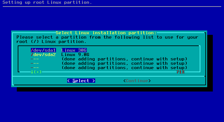 /dev/sda1 sebagai partisi / (partisi root). Sebelumnya telah ditentukan lewat cfdisk untuk partisi / sebesar 30G.