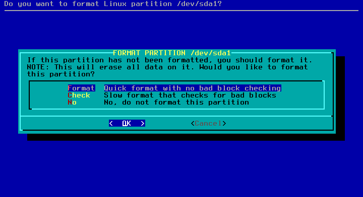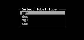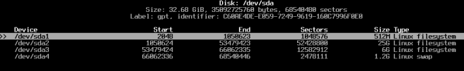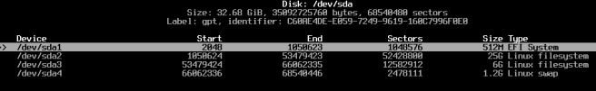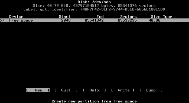 Ketik fdisk -l untuk mengetahui lebih dulu penamaan hardisk. Misal terdeteksi /dev/sda. Anda dapat menggunakan fdisk untuk melakukan partisi atau cfdisk. Contoh di bawah menggunakan cfdisk. Ketik cfdisk /dev/sda.