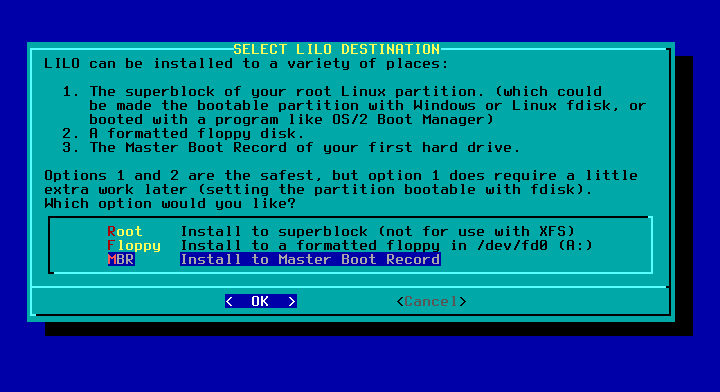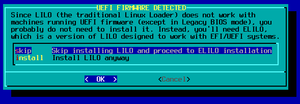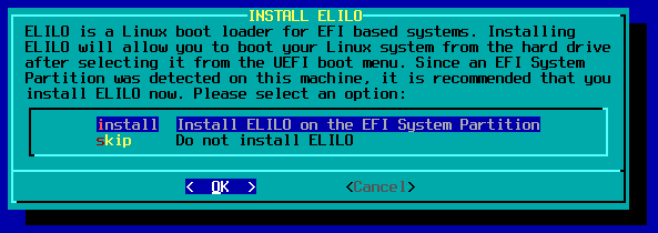 MBR. Pada bagian ini, jika terdeteksi UEFI, maka pada menu diberikan opsi elilo. Dalam kasus ini tidak memakai EFI di VirtualBox.