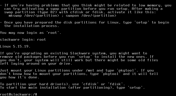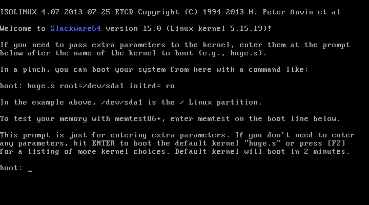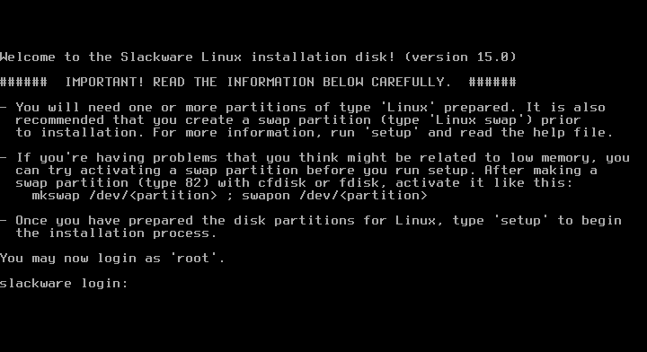 Instalasi dilakukan di VirtualBox agar mudah saat screenshot :). VirtualBox jalan di host dengan OS Slackware 15 juga (PC jadul). Download ISO Slackware64-15.0 dan cek md5sum. Pastikan file iso Anda 100% ok. Lebih baik instalasi dilakukan lewat USB flashdrive agar hidup lebih mudah. Keping DVD sudah jarang ada saat ini. Jika Anda ingin mencicip tanpa perlu melakukan instalasi, gunakan Slackware-Live! (Catatan soal UEFI/EFI ada di bagian bawah tulisan).