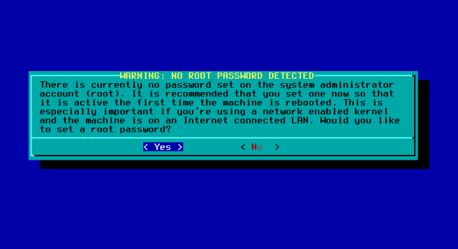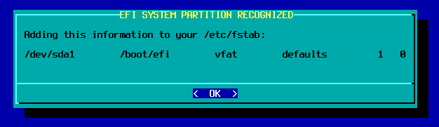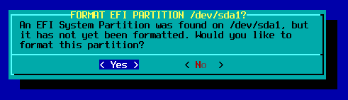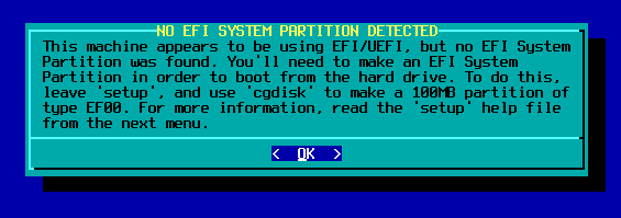 write dan ketik yes.Oke, selanjutnya pada proses setup, jika Anda lupa membuat partisi EFI, maka akan diberi peringatan. Karena pada contoh di atas sudah dibuat, semestinya peringatan di bawah tidak muncul.