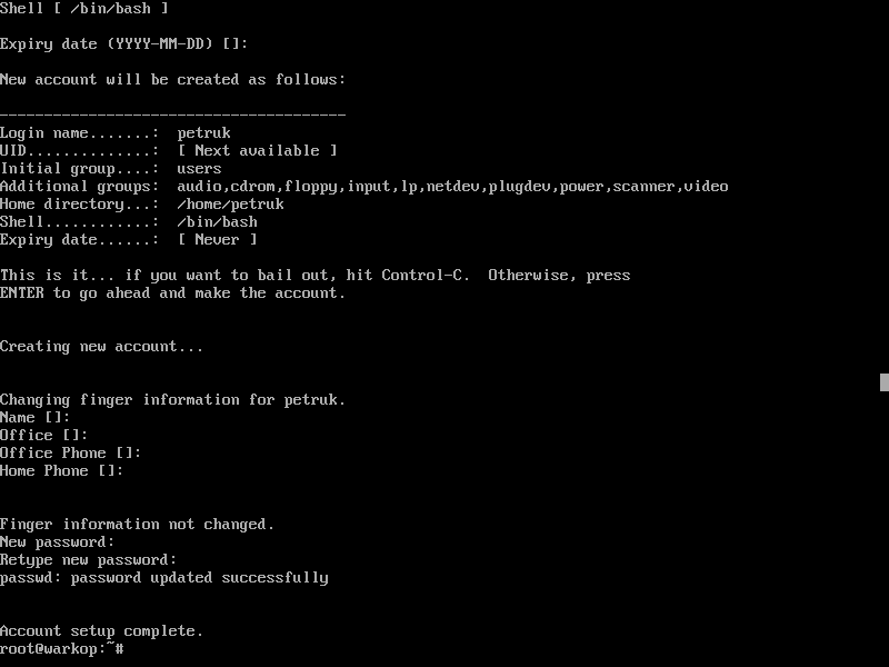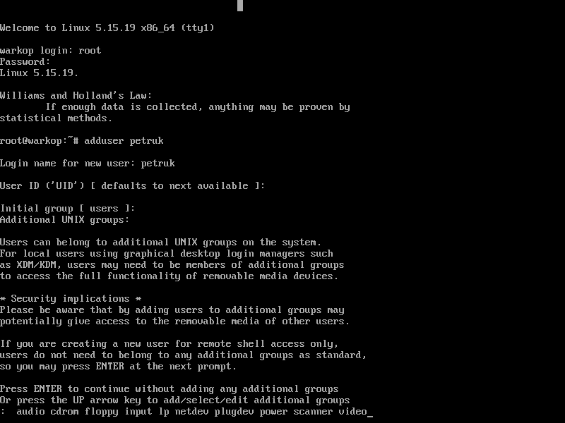 Ketik instruksi #adduser petruk. Tekan Enter, biarkan UID dan Initial group [users] default (tekan enter). Hanya saja untuk Additional UNIX groups, tekan panah atas pada keyboard agar tambahkan group seperti audio, cdrom, dst agar muncul otomatis. Kecuali Anda tidak ingin memutar musik dan nonton youtube.