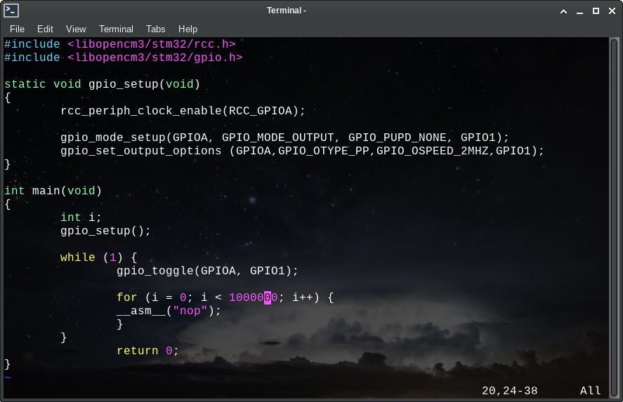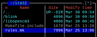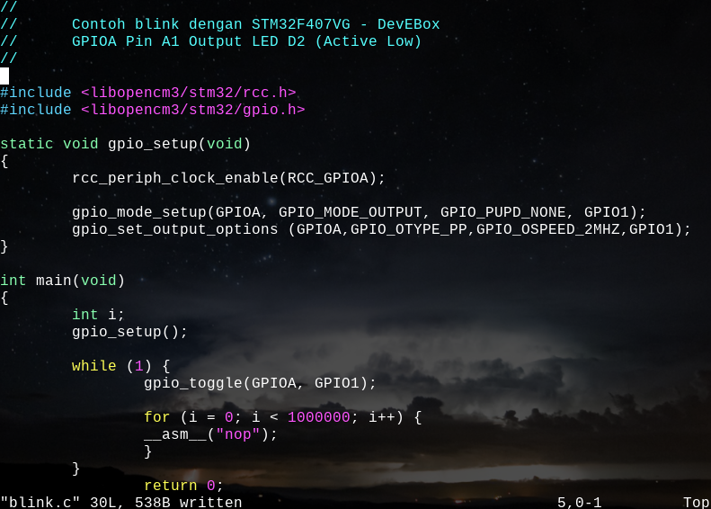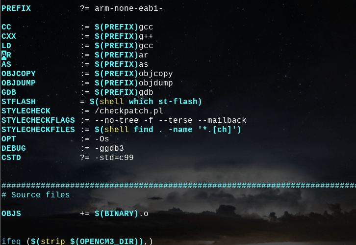 Ada 4 file penting : Makefile, Make.include, rules.mk, dan .ld. Nantinya, untuk kompile/build tinggal ketik “make". Sedang untuk flashing ke chip tinggal ketik : “make flash". Untuk .ld akan dibuatkan otomatis saat make program Anda pertama kali. File linker ini berisi alamat dan besar memory pada chip stm32 yang dipakai. Posisi file tersebut juga penting. Terserah dimana diletakkan, sesuaikan dengan konfigurasi Anda. Lihat lampiran di bawah.