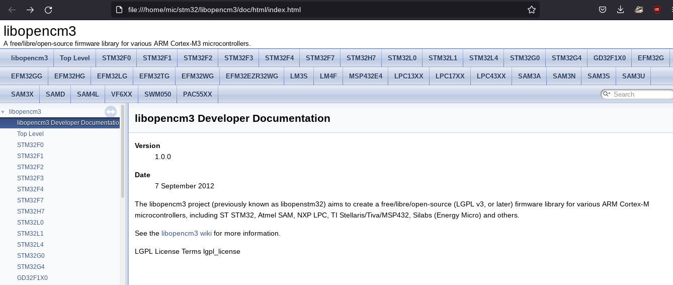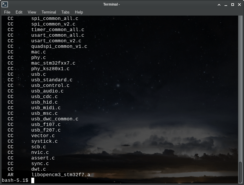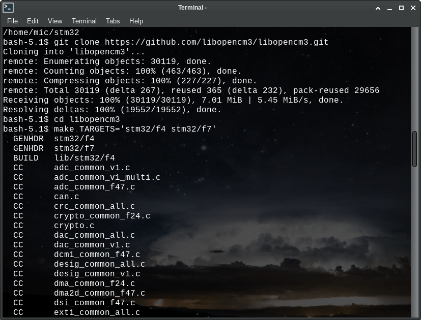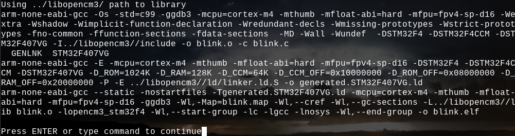 Setelahnya, download/clone libiopencm3. Masuk ke direktori libopencm3 dan ketik instruksi make. Semua library aneka chip akan disediakan. (Hanya instruksi make saja tanpa perlu make install). Jika hanya untuk stm32f4xx dan stm32f7xx, cukup make TARGETS=’stm32/f4 stm32/f7′ .