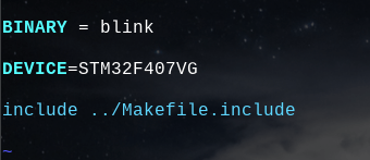 Untuk memulai, dapat digunakan file Makefile dari example yang dimodifikasi sesuai chip. Definisi tipe stm32 ini penting karena akan menentukan LD dan flag saat kompilasi. Contoh di bawah digunakan chip STM32F407VG.