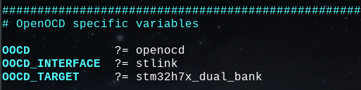 Jika menggunakan teks editor jadul dan Makefile, konfigurasi script target pada OpenOCD di set ke “dual bank” (Karena chip ini mempunyai 2 flash bank yang terpisah). Contoh konfigurasi pada Makefile.rules libopencm3. (Sesuaikan dengan platform yang digunakan jika tidak menggunakan libopencm3).