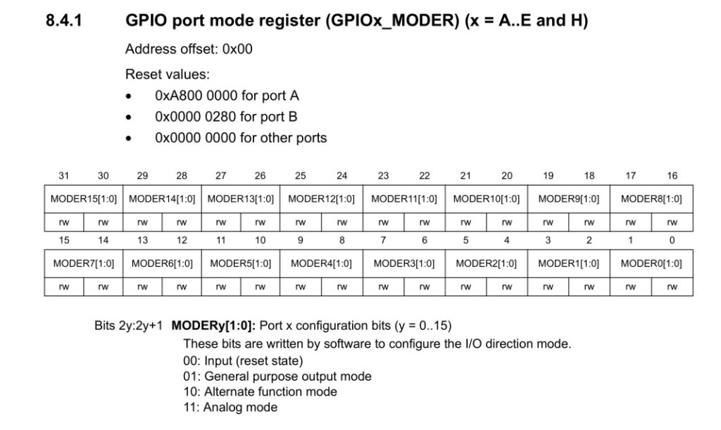 Semisal ingin konfigurasi GPIOA pin PA3 sebagai output. Maka bagian MODER3[1:0] bernilai 0 1.