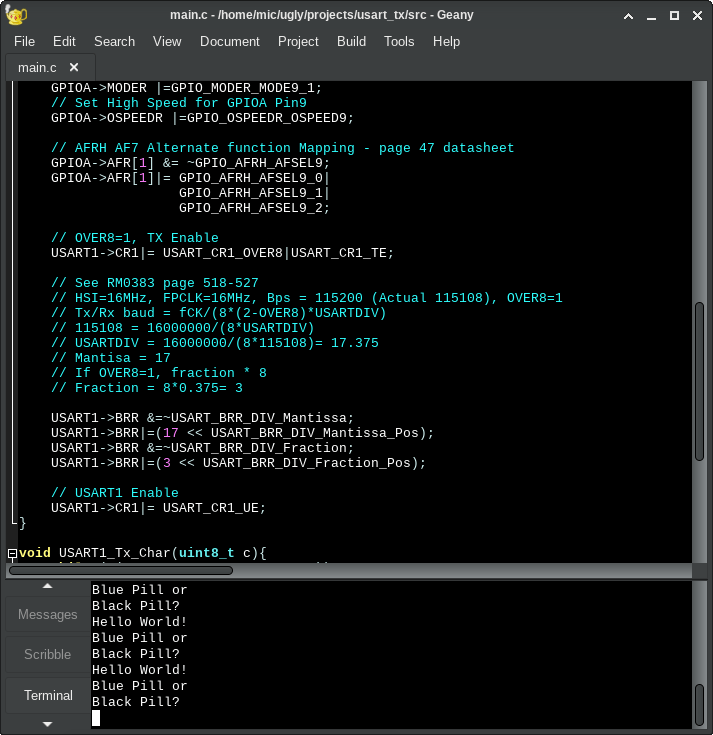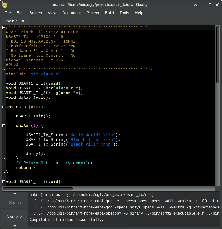 Tapi untuk bahasa pemrograman bare metal seperti C, Geany benar-benar “get the job done!” Bahkan tidak perlu satu plugin apapun. Ibarat petani ya cuma butuh cangkul saja. Mengetik di editor, kompile, dan flashing. Mau debug ya ada tui GDB. Apalagi yang sering bermain teks editor, Geany tidak akan mengecewakan. Shortcut-shortcut siap sedia meluncur!