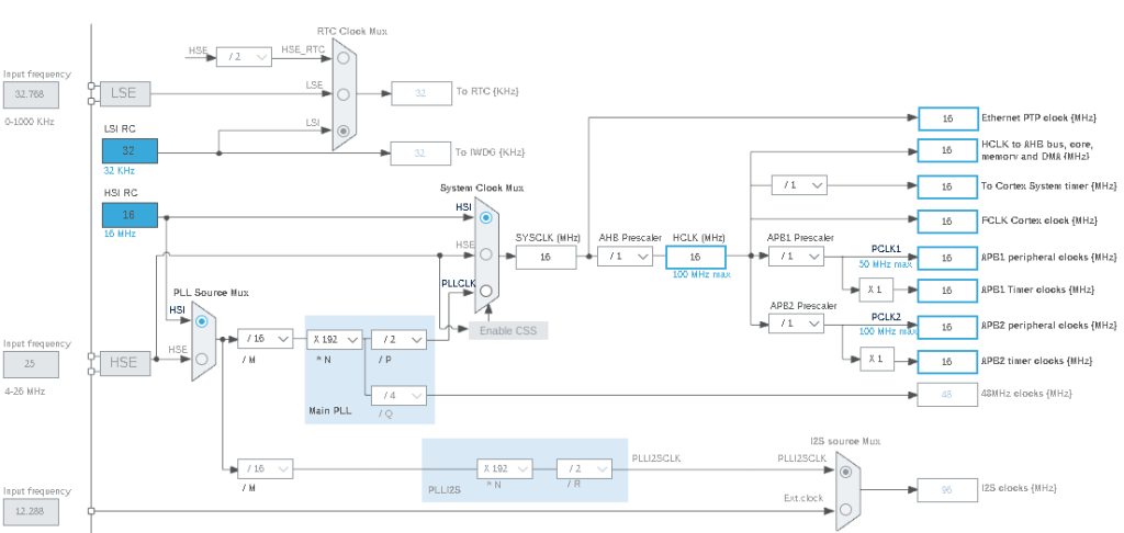 Gambaran besar sistem clock STM32 seperti di bawah. Peripheral APB1 dan 2 misalnya mendapat supply 16MHz. AHB juga dapat jatah 16MHz. PLL bisa dipakai atau tidak dalam sistem clock STM32. Hanya saja, untuk pengaturan yang rigid, PLL diperlukan. Jika tidak, opsi besaran frekuensi akan terbatas.