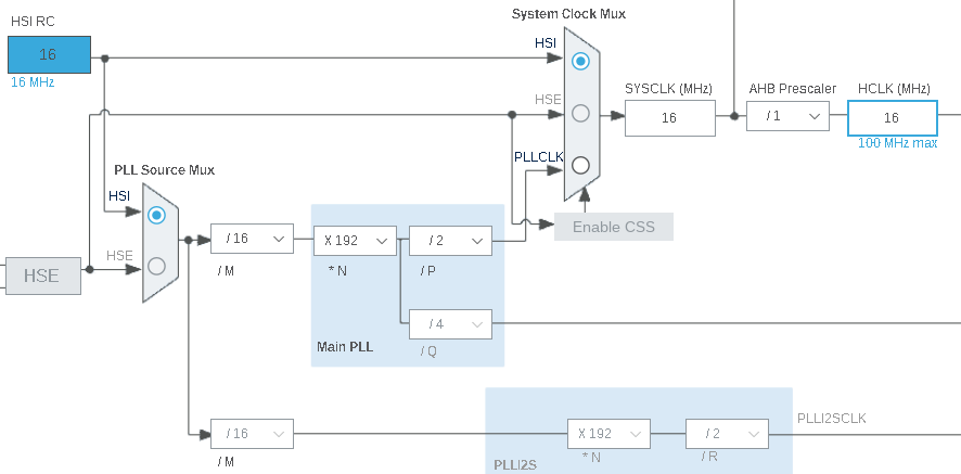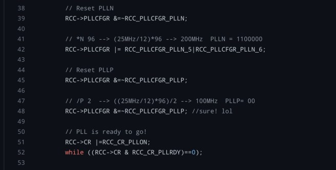 Untuk detail pemrograman bisa dilihat di Github ini. HSI pun lewat PLL bisa di set untuk max PLLCLK 100MHz jika ingin. Tapi akurasi adalah taruhannya. Untuk mengetahui apakah PLL dan speed clock yang diinginkan sesuai, gunakan Timer atau SysTick dan ukur hasilnya di osiloskop atau logic analyzer.
