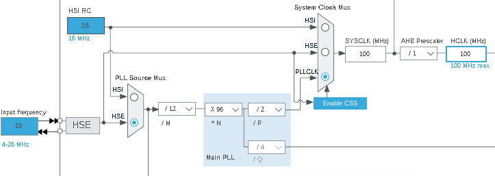 Cara termudah untuk mengetahui faktor pembagi dan pengali di PLL adalah lewat simulasi di STM32CubeMX atau STM32CubeIDE. Gambar di bawah digunakan HSE 25MHz. Xtal onboard 25MHz sudah terpasang pada board Black Pill. Cek skema untuk memastikan.