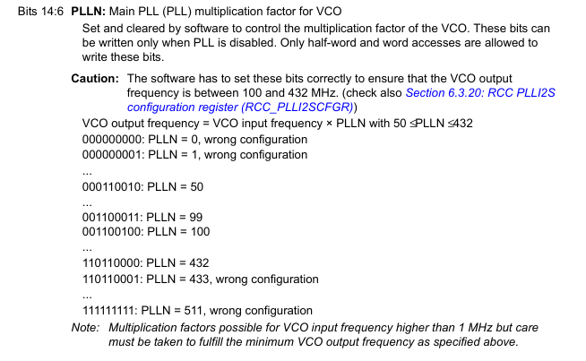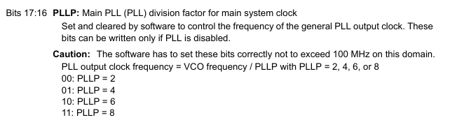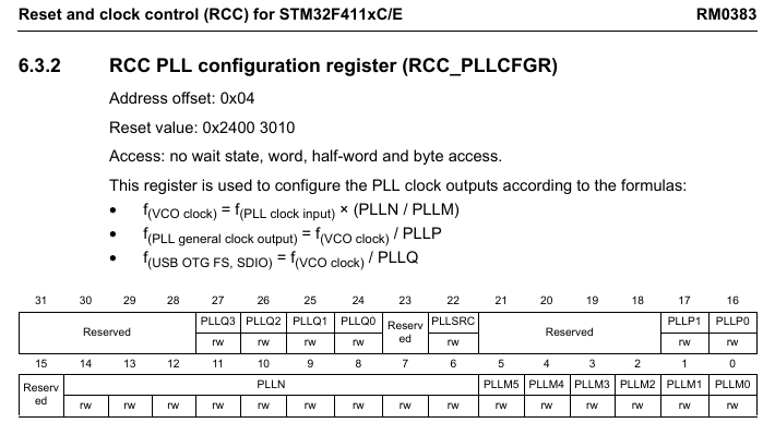 Pengaturan PLL ada pada register PLLCFGR. Untuk mencapai nilai max 100MHz pada HCLK, maka faktor pembagi pada blok M adalah 12. Mengapa 12? Sebenarnya tidak harus 12. Boleh angka lain.