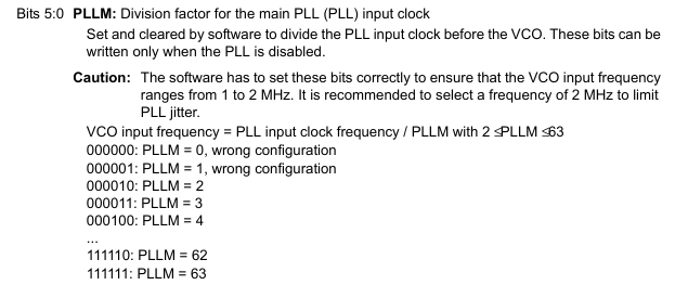 Pada gambar di atas, Bit PLLM Division factor di mulai dari PLLM5 – PLLM0. Jika diinginkan nilai 12, maka perlu set nilai 0b01100.