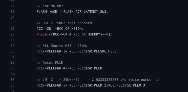 Bagian PLL punya nama blok M,N,P, dan Q. Blok Q khusus untuk Sumber clock urusan USB yang perlu tepat 48MHz. Kalau kurang jatahnya, bisa “ngambek” USB nya lol. Sedang kecepatan 96+MHz mewajibkan waktu baca flash jadi 2WS. Kalau tidak sistem angkat tangan alias hang karena terlalu cepat.