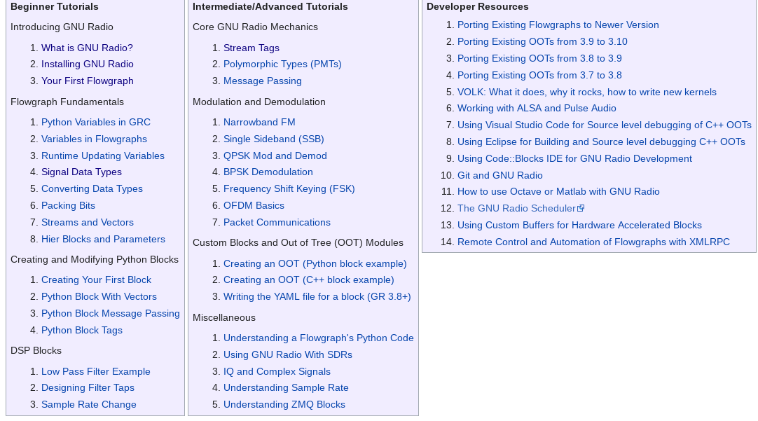 GNU Radio membarui tutorial resminya agar lebih enak dibaca (terutama untuk pemula). Isi tutorial keseluruhan ada 3 bagian : untuk pemula, tingkat lanjut, dan developer. Jika ingin uji nyali, bisa dibalik urutan bacanya mulai dari bagian developer dulu :).