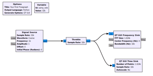 Contoh flowgraph pertama, signal source berupa signal cosinus, dan akan ditampilkan dalam grafik domain waktu dan frekuensi.