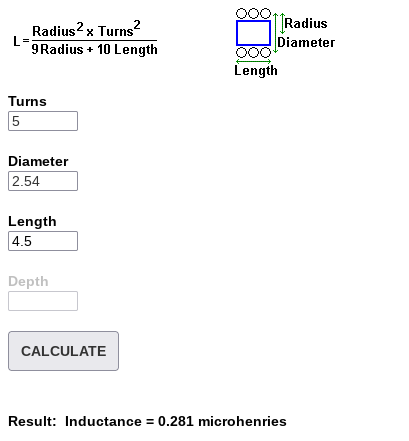 Untuk urusan loading coil, digunakan calculator online. Setelah nilai 0,28uH didapatkan, dicoba-coba memasukkan jumlah gulungan dan panjang loading coil. Panjang di sini bukan panjang kawat email, tapi panjang loading coil/tempat lilitan. Pada hasil perhitungan di bawah, lilitan sebanyak 5 lilit pada pipa paralon (atau apa saja) dengan diameter 1″ dengan panjang 4,5 Cm. Induktansi =0,281uH