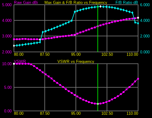 Gain antena ini hanya 2 dBi saja dalam kasus saya. Tapi VSWR mendekati ideal (Untuk simulasi antena 1/4 Lambda, gain sekitar 2,9 dBi). Untuk whip 5/8 Lambda digunakan ukuran 1,87M . (Untuk simulasi yang lain saya menggunakan ukuran 1,78M)