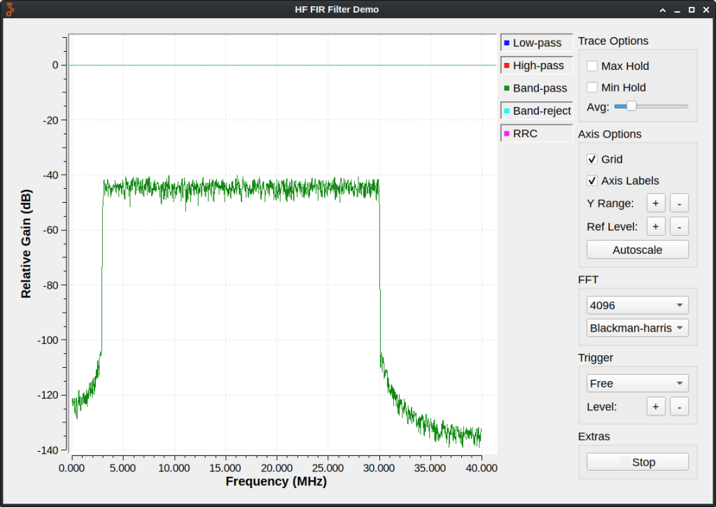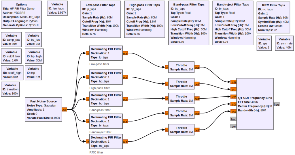Iseng saja ya :). Pada tulisan sebelumnya, filter berurusan dengan signal audio karena sample rate hanya 32KHz. Bagaimana FIR filter pada rentang HF? Atau X-Band sekalian? Frekuensi HF 3MHz- 30MHz pada lingkup radio amatir. Sedang X-Band 8GHz – 12GHz. Beda langit dan bumi, GNU Radio coba demo masak kedua menu tersebut.