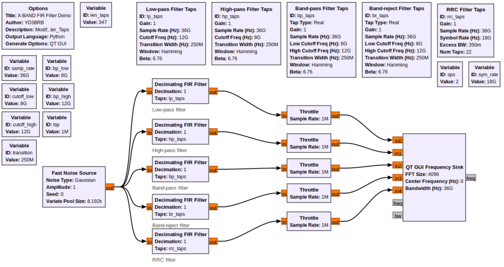 Sedang untuk X-Band karena beroperasi direntang 8GHz-12GHz diperlukan sample rate 24GHz minimal. Kali ini digunakan sample rate 36GHz. File GRC dapat Anda download di sini.