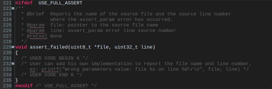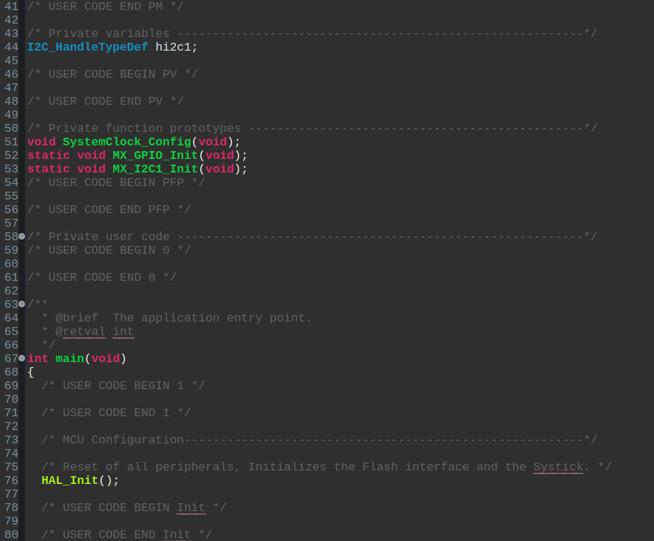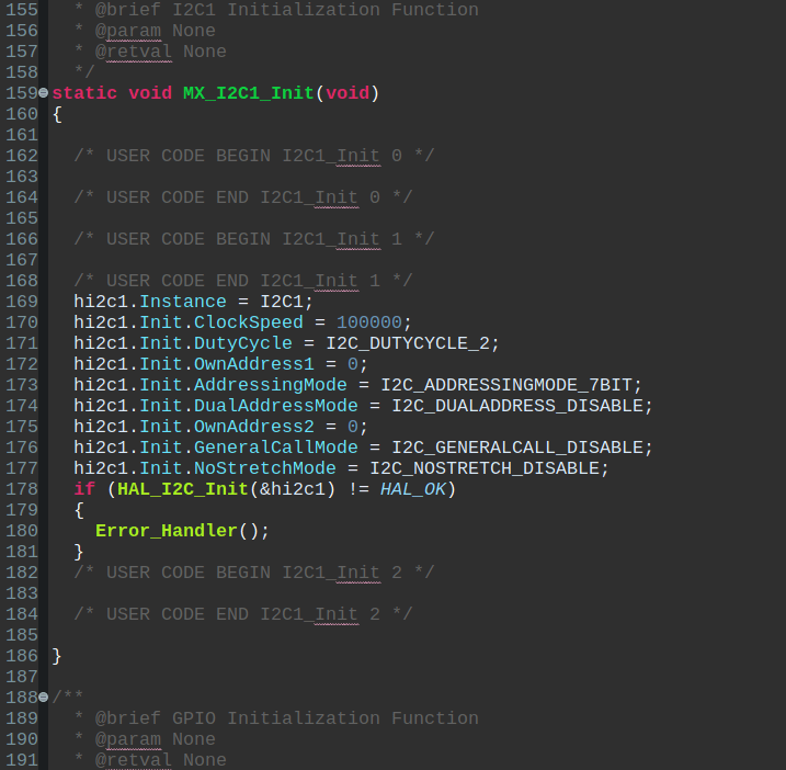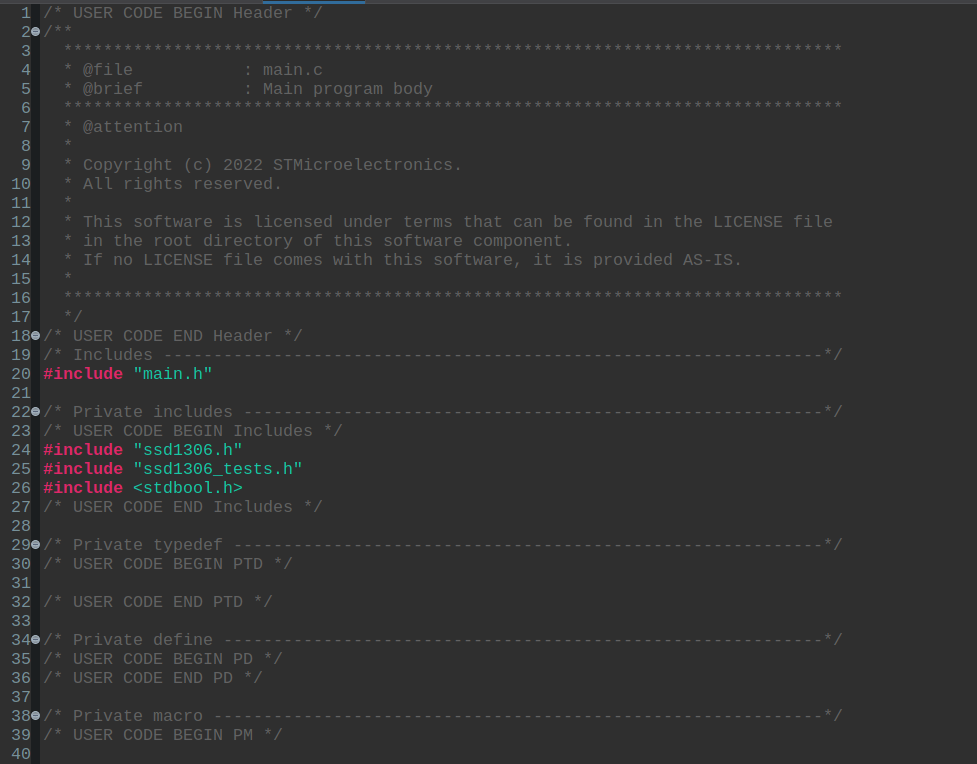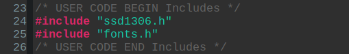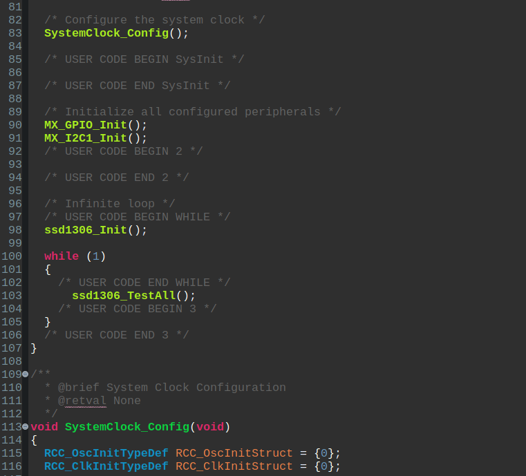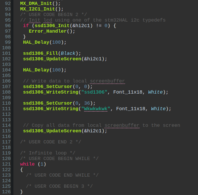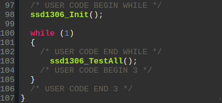 Kode yang diletakkan pada USER CODE BEGIN dan USER CODE END tidak akan hilang saat file .ioc diperbaharui. Pada contoh di atas, ssd1306_TestAll () akan hilang hehe. Jadi lebih baik letakkan di antara line 101 dan 102.