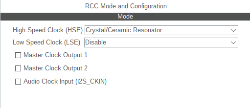 Digunakan Discovery board dengan chip STM32F407VGT6. Listing main.c dan .ioc untuk STM32CubeIDE bisa Anda cek dan download di sini. Board apapun yang dipakai, tentukan RCC lebih dulu mau pakai internal (HSI) atau eksternal clock (HSE). Dalam contoh ini digunakan HSE dengan xtal 8 MHz.